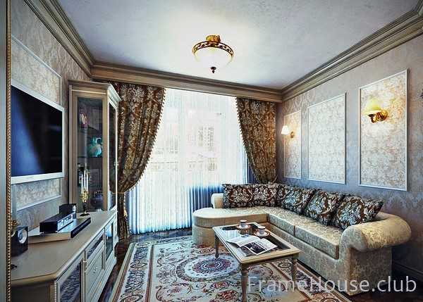 Ощущение неповторимой роскоши, шика вызывают интерьеры гостиных в классическом стиле барокко. Для оформления используются светлые, золотистые тона. Дизайн выделяется мягкостью, плавностью линий: арочные двери, фигурные вставки на стенных поверхностях, прекрасная мебель с изогнутыми подлокотниками, резным декором. Позолоченная лепнина, огромные зеркала в массивных рамах, тяжелые шторы с ламбрекенами дополняют общий облик комнаты.