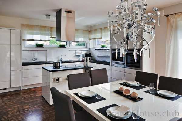 Особенно богатые возможности для дизайна дает интерьер кухни и гостиной в частном доме, где владелец обладает полной свободой планировки и формирования внутреннего пространства. Например, можно использовать компоновку «студио», при которой гостиная и кухня-столовая – это функциональные зоны общего объема. В этом случае можно использовать различные эффекты взаимодействия зон, разную степень их изолированности друг от друга, единство стиля и контраст подстилей.