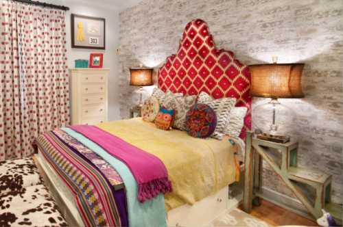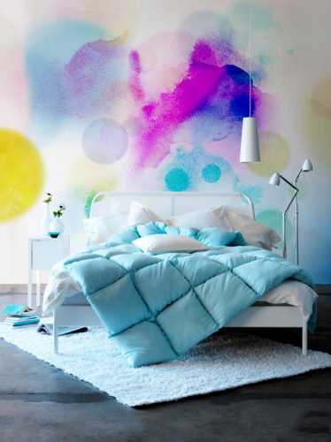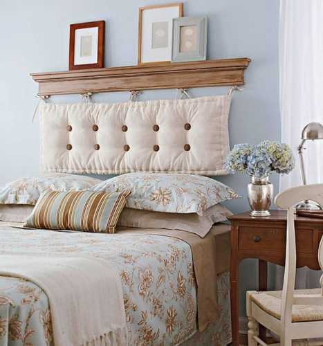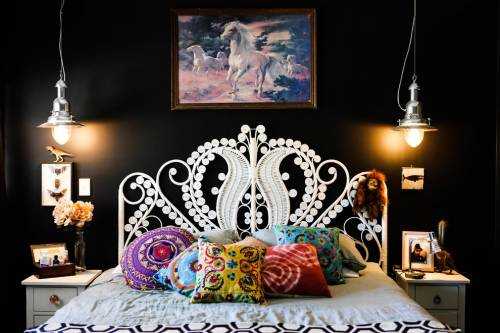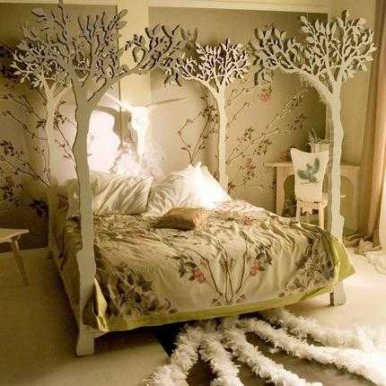 Подумайте, как интересно обыграть изголовье кровати. Используйте декупаж, виниловые наклейки, а если у кровати изголовья нет, можно самостоятельно создать его подобие. Сбейте деревянную раму и обтяните ее тканью. А изящное кованое изголовье можно просто нарисовать на стене в технике 3D.