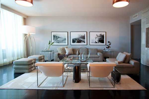 Обратите внимание на фотошторы, которые сделают монохромную гостиную оригинальной и современной.