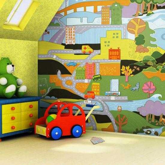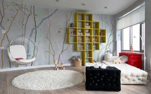 В интерьере детской радостное и шутливое настроение создадут цветные занавеси. Декоративный рисунок текстиля мебельной обивки, а также объемное 3D покрытие пола усилит эффект ликования.