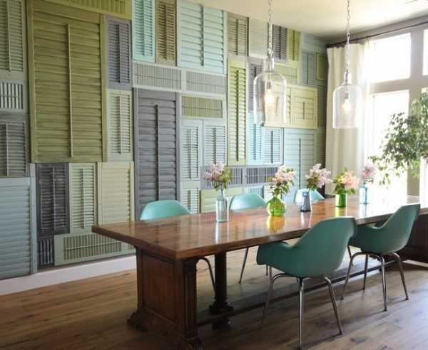 Разноцветные старые ставни для окон в декоре стен квартиры