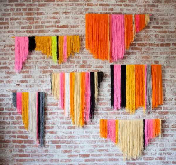 Идея для богемного декора кирпичной стены с помощью вязальной пряжи