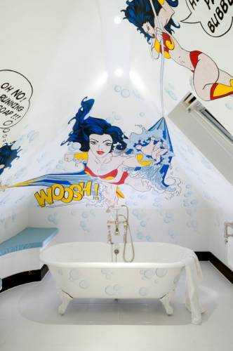Оригинальное решение: комиксы на стенах и потолке ванной комнаты