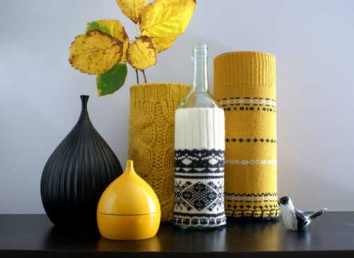 - Вязание. Крючок или спицы – любой инструмент подойдет для изготовления плоских и объемных декораций. Обычно вяжут игрушки, своеобразные чехлы для цветочных горшков, ваз, всевозможных коробочек, стаканчиков и органайзеров, абажуры для светильников, декоративные салфетки, коврики и прочие мелочи.