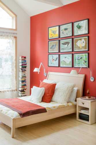 Однотонные стены можно и нужно украшать различными, характерными для общего стиля помещения, предметами. На фото — декор цветным бумажным скотч