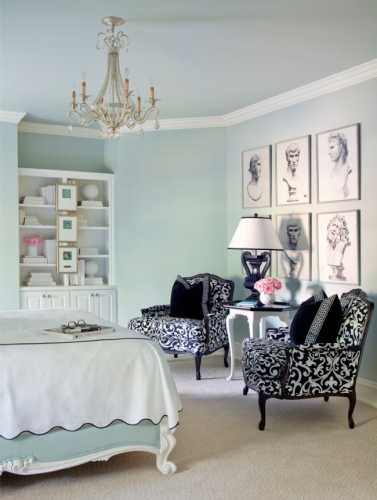В спальне никогда не помешает дополнительный уют. Если у вас простая компактная люстра, дополните ее элементами елочной гирлянды и несколькими лоскутами «невесомой» прозрачной ткани вроде органзы. Стены можно традиционно украсить картинами, то есть изображениями в рамах. Чем оригинальнее рама, тем проще может быть сам рисунок – подойдет даже фрагмент обоев. Рамку можно покрасить, приклеить объемные декоративные элементы – бусины, камешки, ракушки.