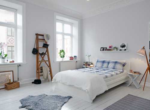 Скандинавскую спальню украсит декоративная стремянка, которую можно использовать как вешалку