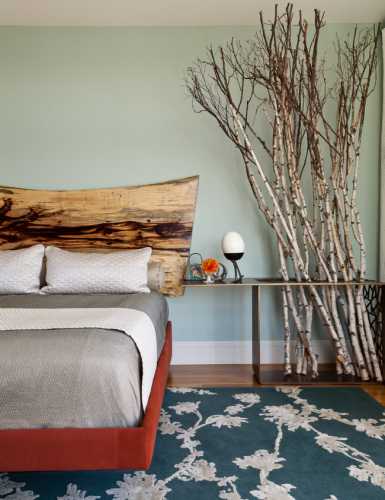 Необычное решение для оформления изголовья кровати. Тут использовано цельное, практически необработанное дерево