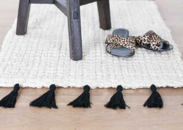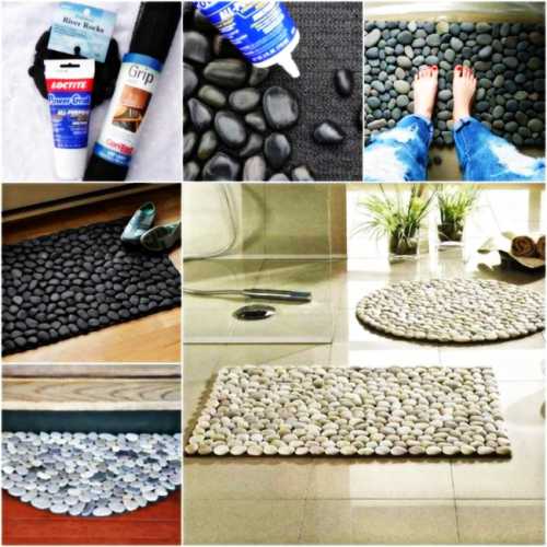 И еще одна интересная и практичная идея – коврик для ванной из морских камешков. В качестве основы берем самый простой резиновый коврик или фрагмент линолеума. Наносим универсальный клей на всю поверхность основы и выкладываем заранее приготовленную гальку. Лучше подобрать небольшие и плоские аккуратные камешки. При украшении ванной комнаты своими руками позаботьтесь о том, чтобы все материалы были водостойкими.