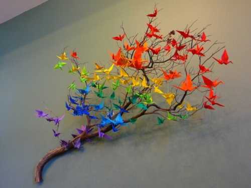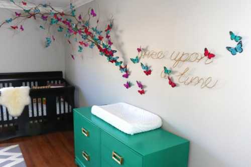 Яркие бумажные бабочки на веточке мило смотрятся в комнате малыша