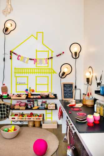 Детская кухня, стены которой декорированы с помощью наклеек, гирлянд и оригинальных настенных светильников. Такое пространство для ребенка может создать любой взрослый.