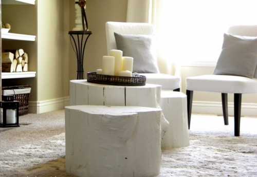 Простой журнальный столик из необработанного светлого дерева, украшенный резьбой
