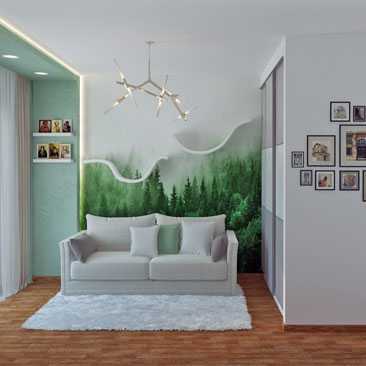 Интерьер гостевой комнаты с фотообоями с берёзами