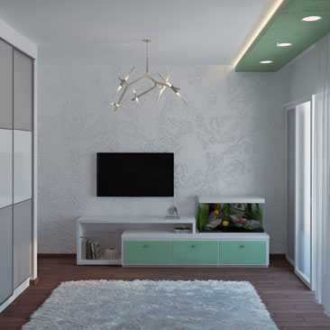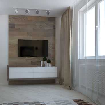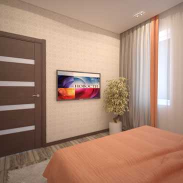 - Телевизор. Гости смогут расслабиться и посмотреть любимую передачу или фильм. Удобнее всего разместить его на стене перед зоной отдыха, то есть перед диваном и креслами или кроватью.