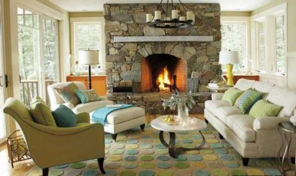 Смысловой центр интерьера гостиной в частном доме — это камин или домашний кинотеатр. Исходя из его расположения в комнате расставляются все предметы мебели: