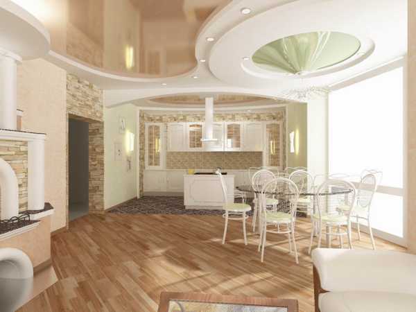 Натяжной потолок с фигурными вставками в гостинойСовет! Натяжные потолки могу создавать многоуровневые конструкции, которые можно использовать для зонирования пространства.