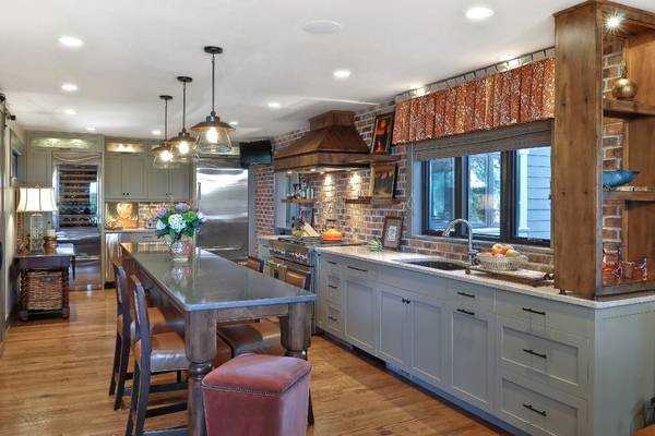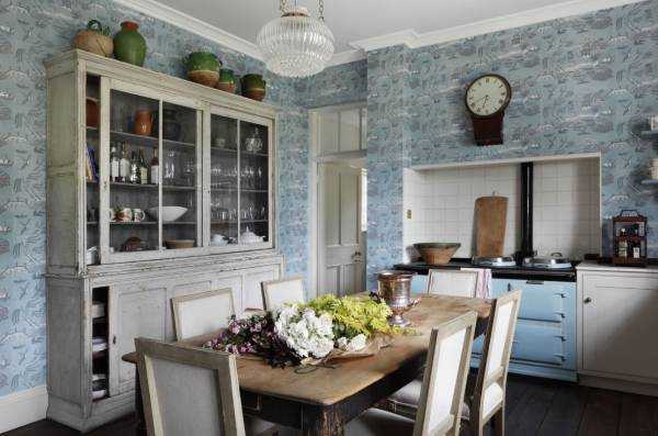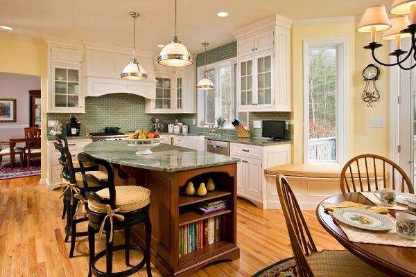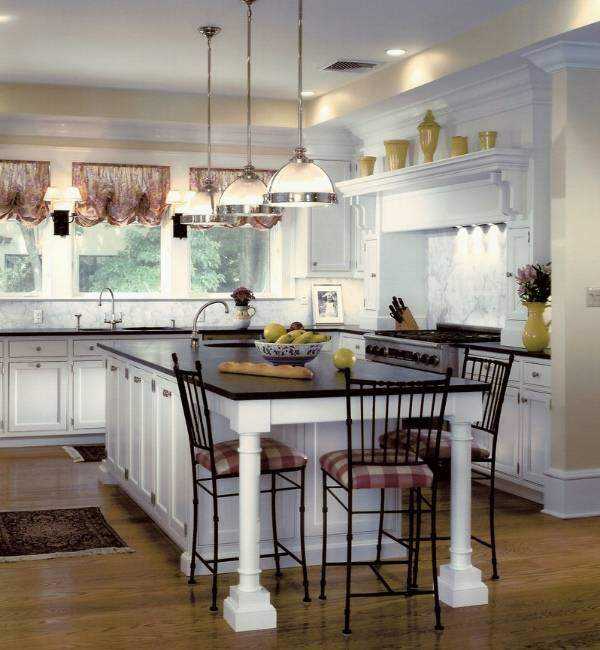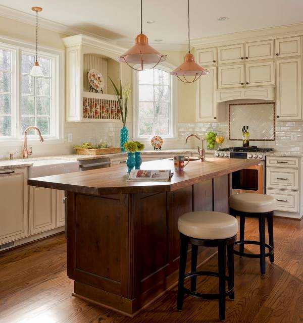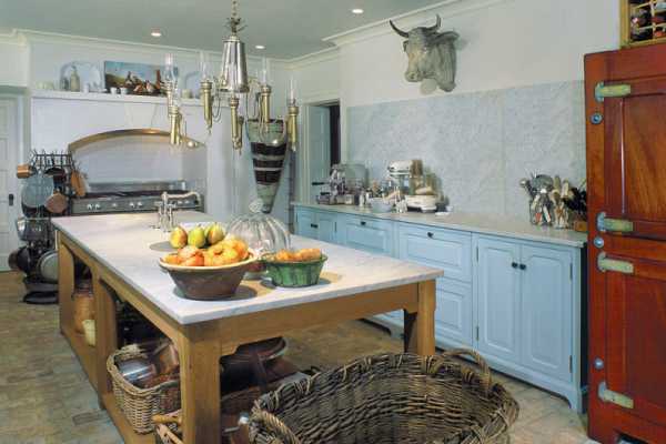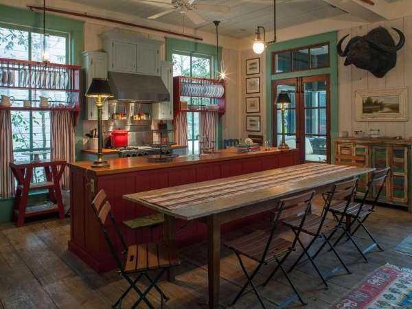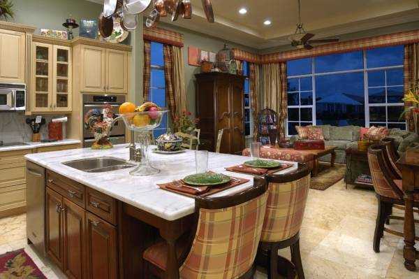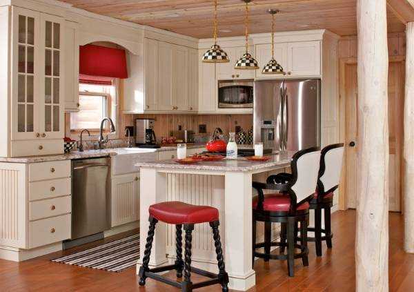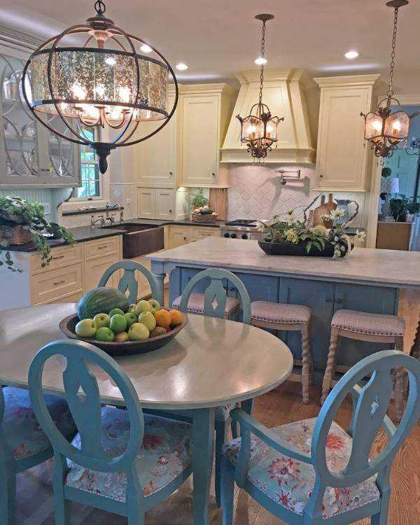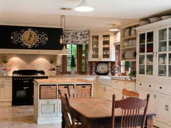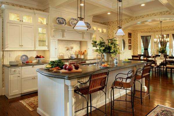Когда площадь интерьера позволяет, центральным элементом кухни может стать остров с барной стойкой и дополнительным местом для хранения кухонной утвари. В маленькой квартире вместо него может быть обустроена столовая зона с выразительными стульями (плетеные, кованые, обитые кожей или даже разные). Открытые настенные полки и винтажный буфет помогут красиво украсить интерьер кухни в стиле кантри тарелками и другими керамическими изделиями. В целом, при выборе мебели и декора для кухни кантри стоит ориентироваться на изделия ручной работы, в том числе художественная роспись, ковка, резьба по дереву и т. д.