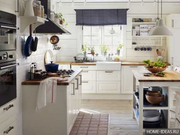 Подоконники, верхние шкафчики и подвесные полки декорируйте связками сухих трав, чеснока, лука и лаврового листа; расставьте горшки с живыми цветами и вазы с овощами и фруктами. Окна кухни не завешивайте слишком вычурно и обильно, вместо этого ограничьтесь шторками с небольшой сборкой, сшитыми из батиста, льна или ситца.