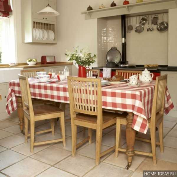 На пол не плохо бы постелить аккуратный тряпичный коврик с пестрой расцветкой, стол застелить клетчатой скатертью, а зону у плиты украсить салфетками и прихватками.