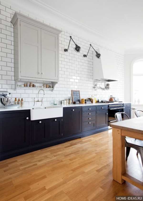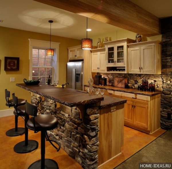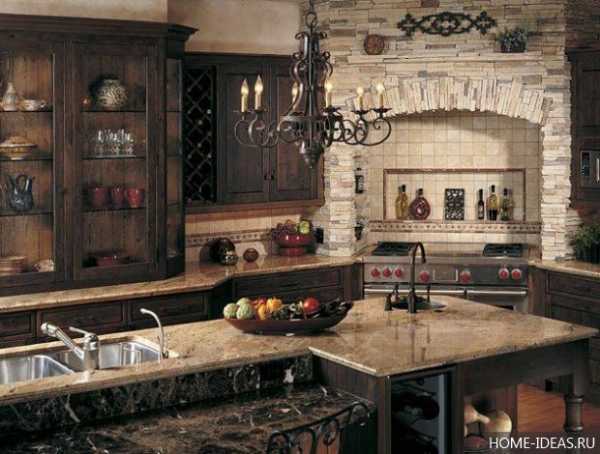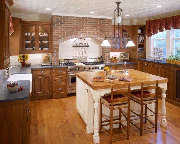 Нередко можно встретить полное или частичное оформление стен каменными панелями или кирпичом. В небольших количествах, например, только кухонный фартук, стилизованные колонны или какая-то отдельная зона, кирпич или камень смотрятся очень интересно. Однако полностью кухня из этих материалов выглядит маленькой и теряет свой деревенский шарм, превращаясь в заброшенную берлогу, близкую к лофт-стилю.