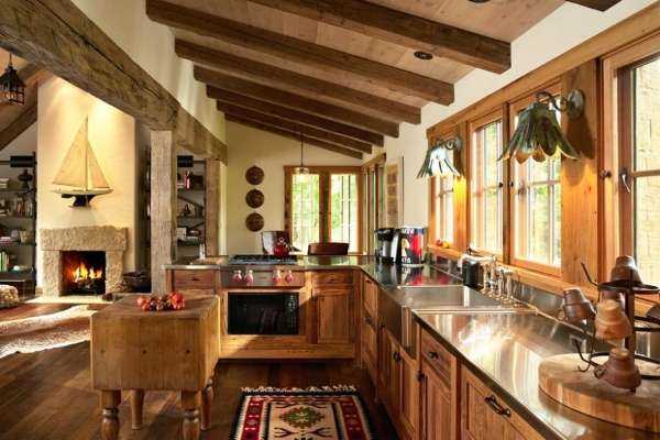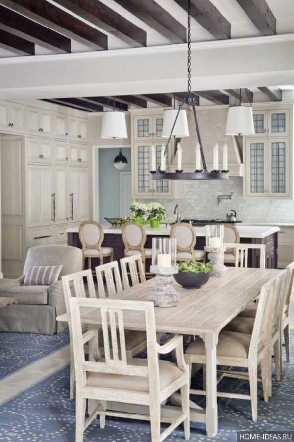 Стены в кухне оклейте однотонными нейтральными обоями без рисунка, или просто аккуратно оштукатурьте, покрывая затем краской. Чистый, светлый и ровный потолок, зачастую украшенный декоративными балками из дерева – примечательная деталь кантри интерьера кухни. Но если, к примеру, на поверхности видны небольшие неровности или бугры, это может стать в некотором роде, изюминкой и расстраиваться не стоит.