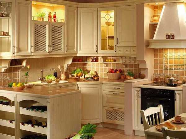 фото интерьера, дизайн кантри прованс угловой маленькой кухни, плитка, аксессуары и оформление