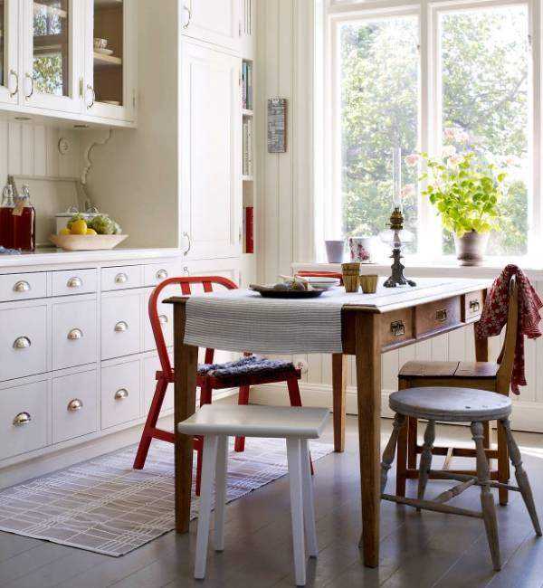 Вместо стульев отлично подойдут деревянные лавки, на которые можно набросить лоскутный плед или специальные мягкие подушки.