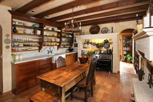 - Полы на кухне. Особенности зонирования. Особое внимание заслуживает и оформление пола на кухне. Оформляя кухню в стиле кантри, стоит задуматься о безопасности и удобстве уборки «рабочей кухонной зоны». Обычно она располагается в районе плиты. Очень часто напольное покрытие в этой зоне укладывают плиткой. Но у нас кухня «кантри», поэтому предпочтение стоит отдать плитке с эффектом старения, старинными узорами и орнаментами, имитацией трещин и потёртостей.