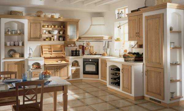 Акцент во всем облике кантри кухни делается на материалах, используемых в ее оформлении.