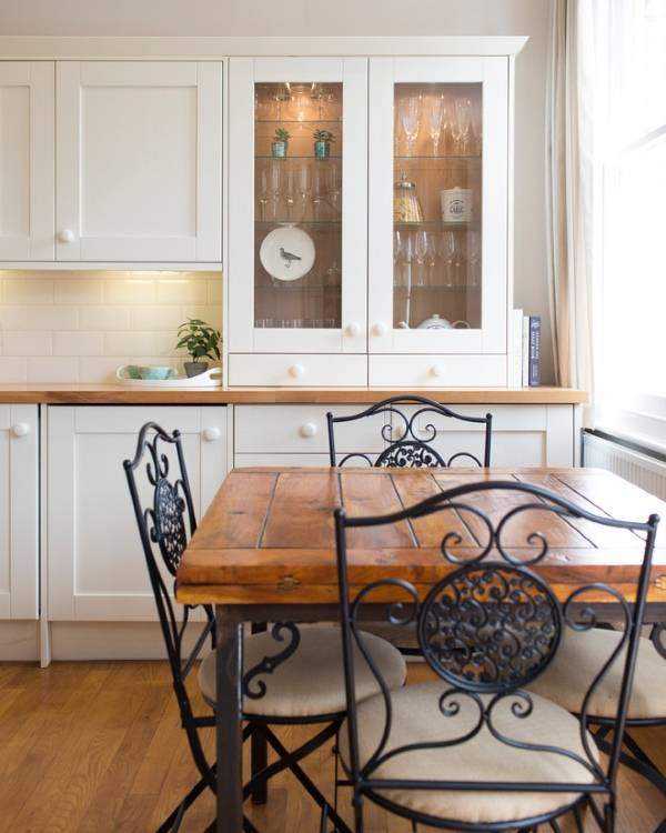 Фасады мебели лучше подобрать ровные, в виде сплошных полотен без очевидного резного декора или со вставками из простого стекла. Рабочие столешницы – из камня или дерева, обеденный же стол – прочный и основательный, в форме круга, прямоугольника или овала, всегда из дерева. В качестве мебели для сидения можно выбрать деревянные стулья со спинками и мягкими сменными сиденьями. Разнообразят обстановку пара небольших кресел или мягкий уголок.
