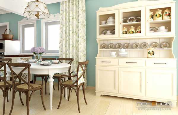 Плиту с вытяжкой, шкафчики для кухонных принадлежностей; раковину и полку для сушки посуды над ней, соответственно, расположите у противоположной серванту стены. Таким образом, обстановка помещения кухни будет восприниматься упорядоченной и, в то же время, расслабленной, что очень важно для стиля кантри.
