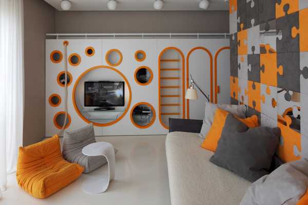 Для комнаты в стиле «техно» уместной будет светло-серая палитра, с яркими вкраплениями аксессуаров и других элементов декора на стенах и мебели. Этому стилю свойственны необычные формы, встроенная мебели и техника. Необычной формы могут быть также люстры и светильники.