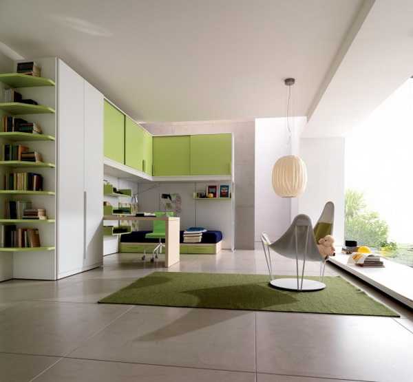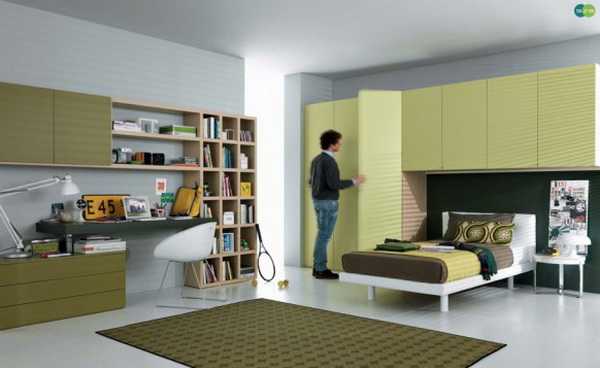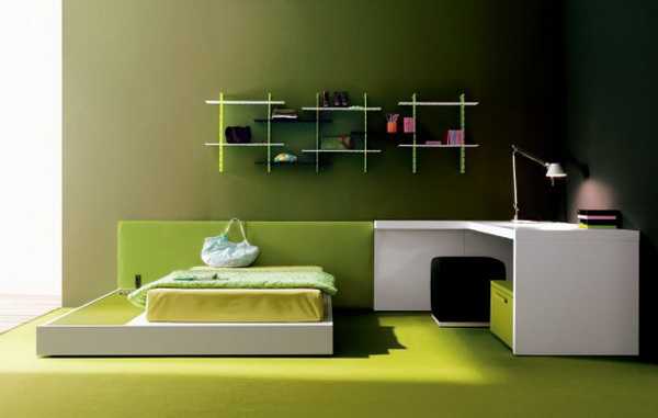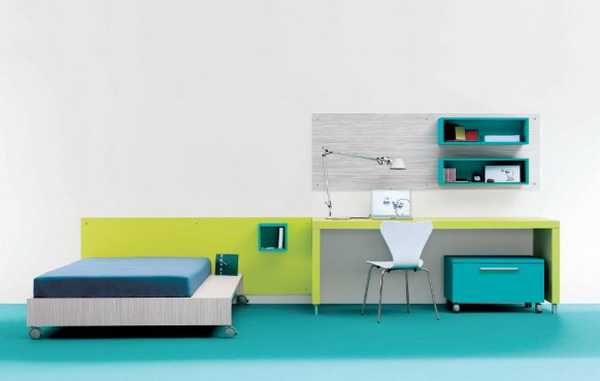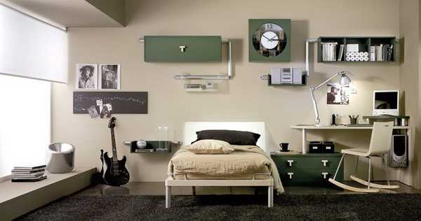 Минимализм в интерьере мальчика подростка - Навесные полки на стене помогают организовать множество вещей и содержать комнату в порядке. В то же время красочные, яркие светло-зеленые оттенки (лайма, мяты, травы) добавляют в комнату радостного настроя. Кстати, о свойствах и влиянии зеленого цвета на человека есть отдельный материал на сайте.