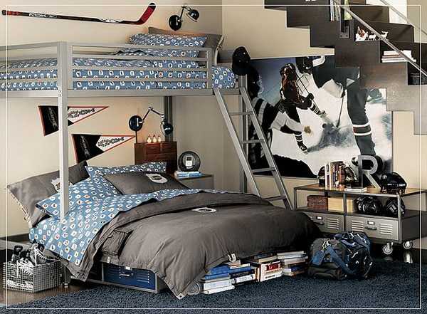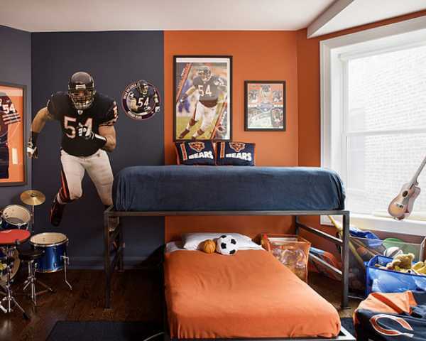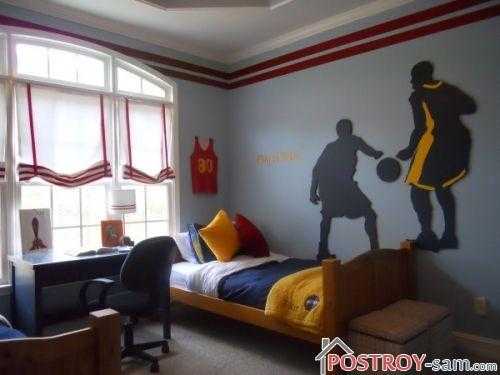 Для подростков, которые занимаются спортом, прекрасным решением является оформление комнаты в спортивном стиле. Здесь в декоре вполне уместными будут яркие краски, игра контрастов. Стены могут быть оформлены в спокойных тонах, а декор уже выбирается в зависимости от вида спорта. В игровой зоне можно поместить баскетбольную сетку или боксерскую грушу. Стены можно оклеить тематическими наклейками.