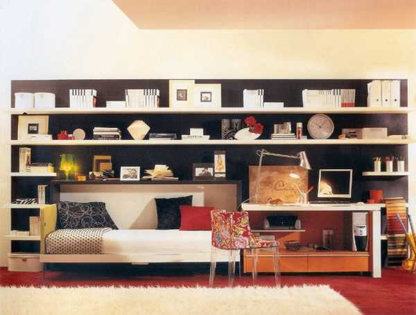 Большое количество настенных полок позволит лучше организовать вещи подростка - Место для занятий и для сна одновременно? Легко! С многофункциональной мебелью так легко обустроить даже малогабаритную подростковую комнату для мальчика. Варианты трансформируемой мебели для небольшой квартиры – здесь.