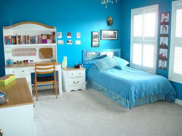 Довольно часто дизайнеры и дети предлагают оформлять комнату в синем цвете. Это цвет, который способствует моральному и физическому расслаблению, создает великолепную атмосферу безопасности, способствует умственному развитию. Но вместе с тем много синего цвета в комнате не должно быть, так как перебор может сделать ее холодной.