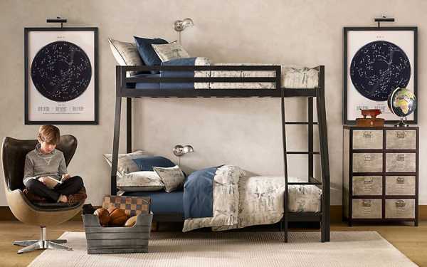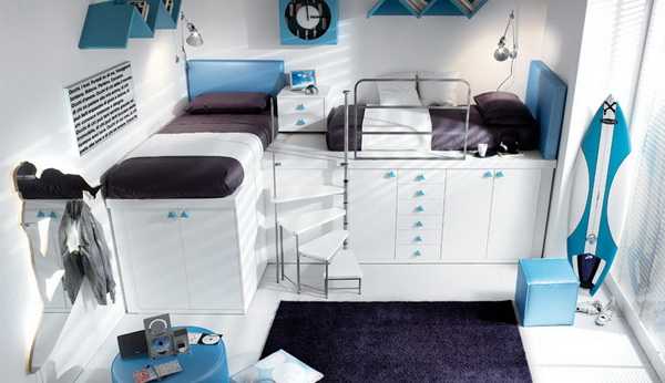 В качестве удобной мебели лучше всего использовать мебель-трансформер, которая оставит больше свободного места. Если в комнате обитают два мальчика, то интересно поэкспериментировать с двухъярусной кроватью, такое решение не только сэкономит место, но и будет очень увлекательным для парней.