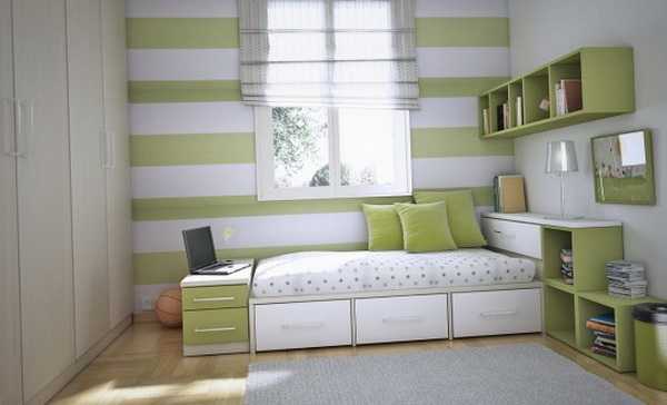 В маленькой комнате сложно представить широкую полноценную кровать. Здесь можно предложить диван, который каждый вечер необходимо раскладывать, узкую кровать либо широкую кровать, но с задвижным механизмом.