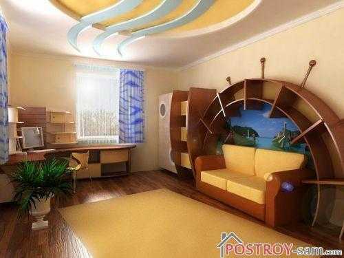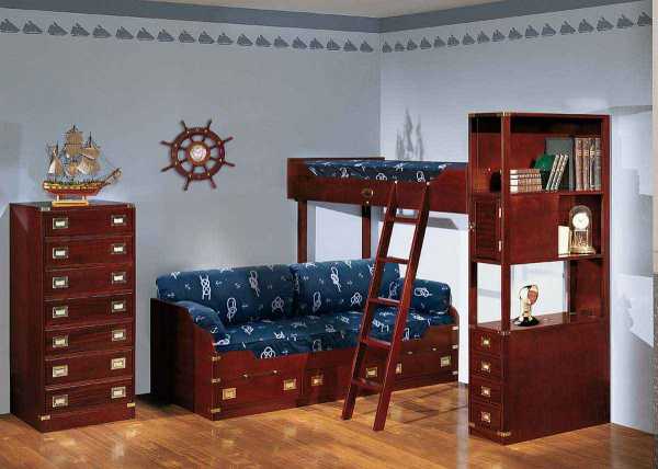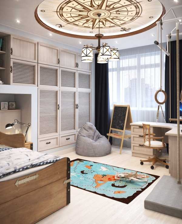 Морская тематика может прослеживаться во всем дизайне или же отражаться в некоторых деталях. Комнату можно обустроить в виде каюты. Кровать, к примеру, может напоминать корабль.