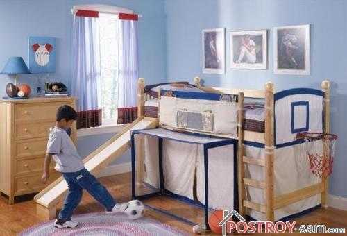 В игровой зоне можно установить шведскую стенку, боксерскую грушу, две одинаковые книжные полки. Каждый мальчик должен иметь свою часть стены, где он сможет разместить плакаты и фотографии по своему вкусу.