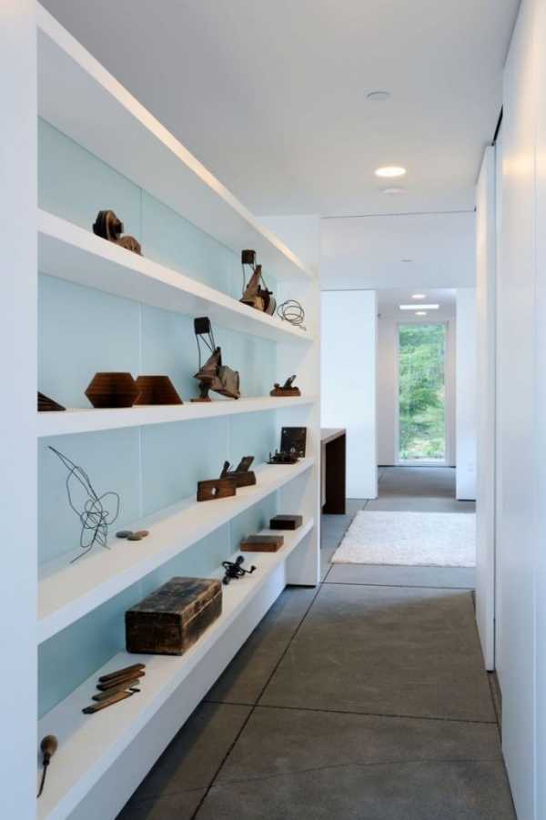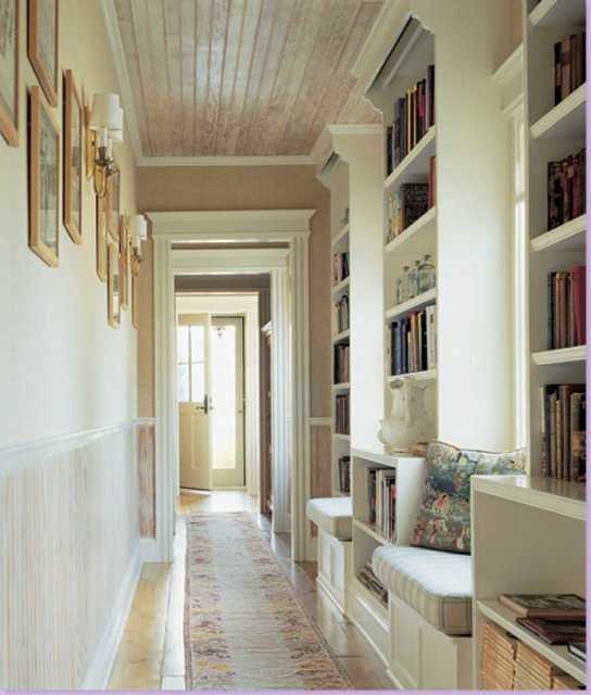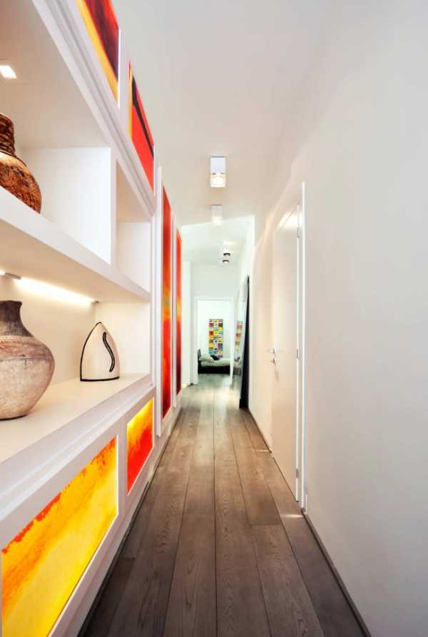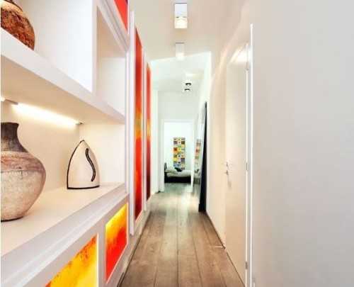 Также большие полки вдоль всей стены узкого коридора можно наполнить приятными мелочами: интересными статуэтками и сувенирами