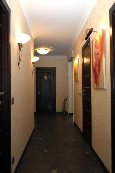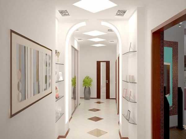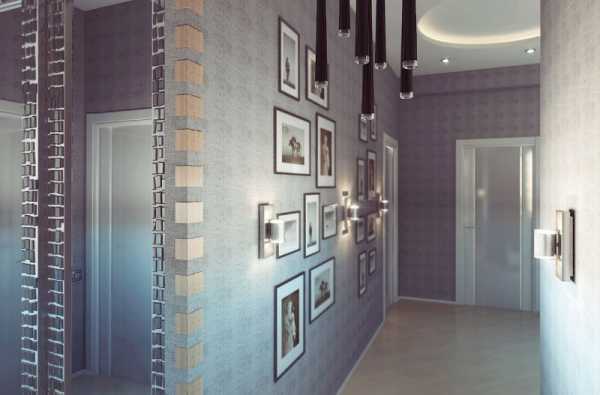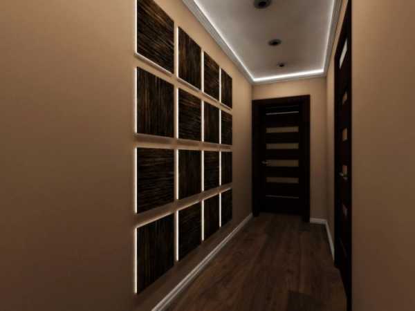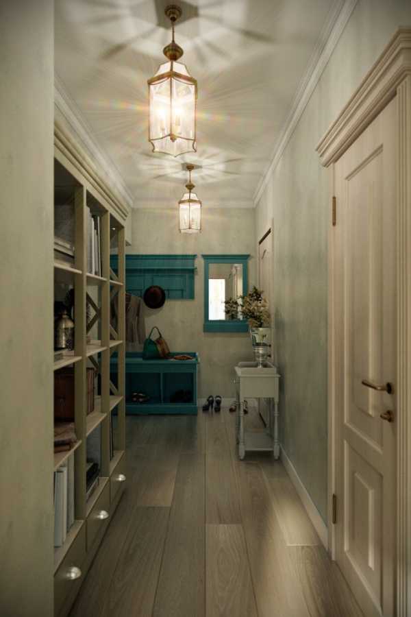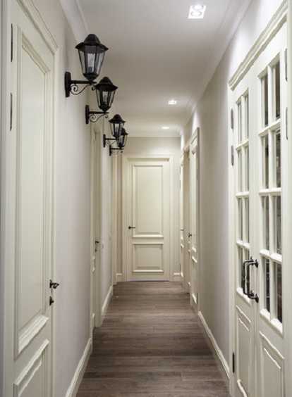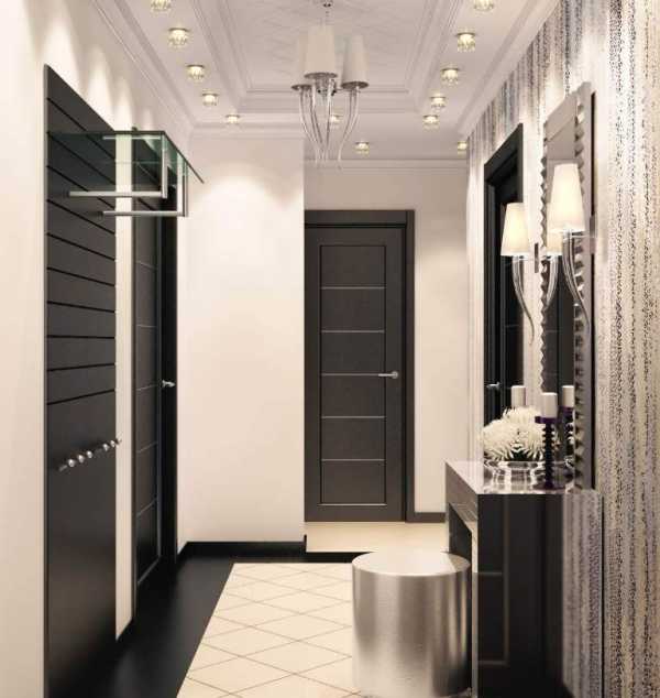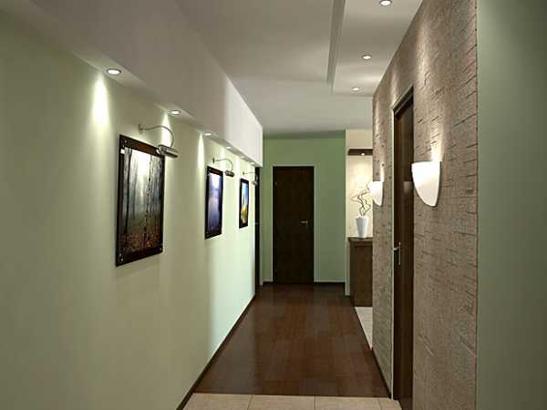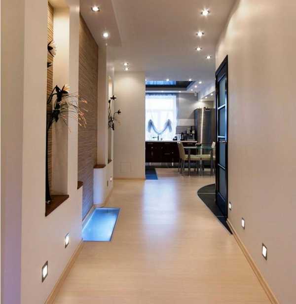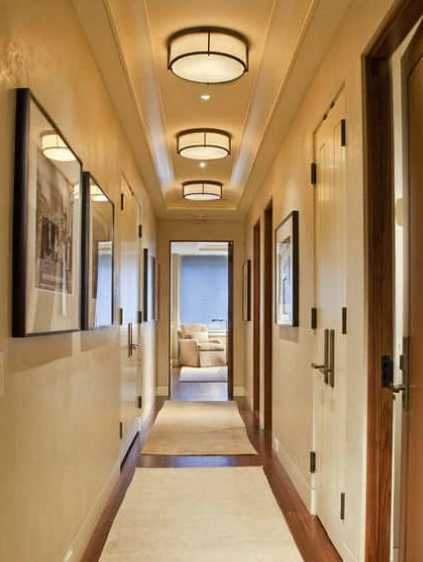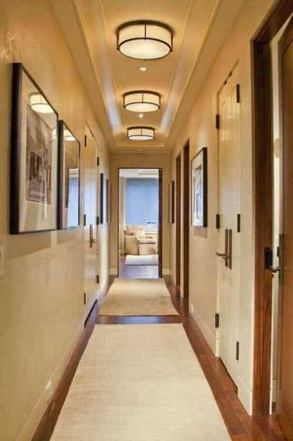 В первую очередь следует запомнить, что для подобного помещения следует организовать качественное освещение. При наличии короткого коридора (менее трех метров в длину) можно установить один потолочный светильник, расположив его в центральной части потолка. Для более длинного коридора предпочтительно использовать несколько потолочных светильников (люстр, ламп либо спотов), размещенных на равном расстоянии друг от друга, так чтобы лучи света распространялись равномерно.