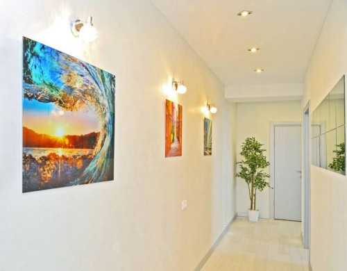 Акцент на светлых стенах можно расставить при помощи картин или обойных вставок. Примеры удачной отделки стен коридора представлены на фото.