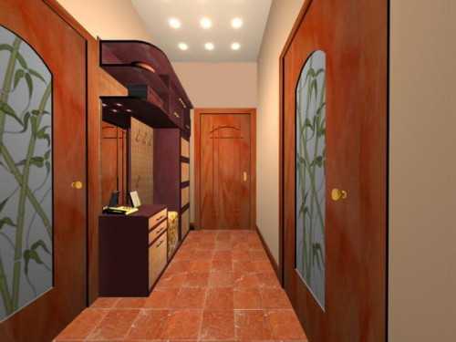Создавая интерьер для узкого длинного коридора, необходимо позаботиться об освобождении пространства от лишних деталей и массивных конструкций. При необходимости размещения шкафов-купе, желательно выбирать нестандартный вариант длинного неглубокого шкафа, максимальной протяженности.