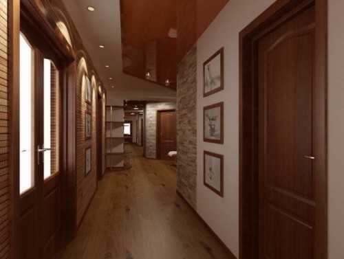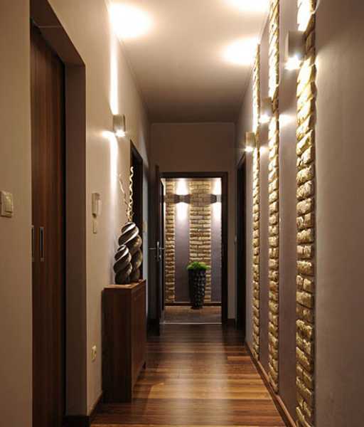 Коридоры имеют различную протяженность. Встречаются действующие проекты, в которых узкий длинный коридор имеет большую протяженность, уходя вглубь жилого дома или квартиры. Самым большим недочетом этого помещения считается отсутствие оконных проемов. Только дверные, ведущие к жилым комнатам. Поэтому, для дизайнера первоочередной задачей становится грамотно снабдить его дополнительным освещением, визуально расширив стены, чтоб коридор не выглядел тоннелем.