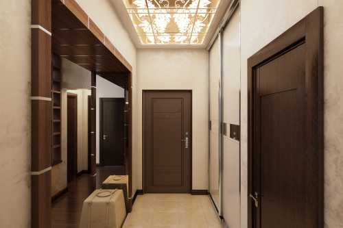 В узкой длинной прихожей он обязательно должен быть на тон светлее, чем базовый оттенок стен. Для экономичного варианта — подойдёт обычный потолок со встроенными небольшими светильниками. Для дорого интерьера — можно сделать его из гипсокартона (любой формы и уровня), но не следует наполнять замысловатыми фигурами.