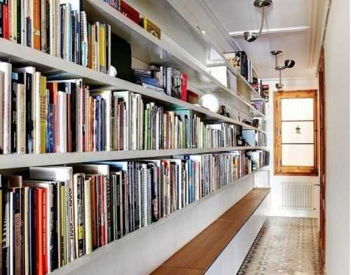 Свою личную библиотеку можно разместить прямо в коридоре, вы сэкономите пространство, не загромождая других комнать большими книжными шкафами и полками, а также выглядеть это будет очень эффектно