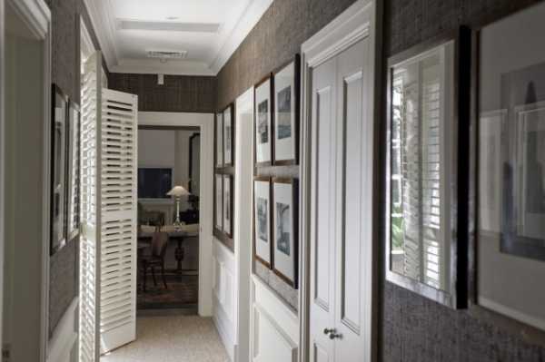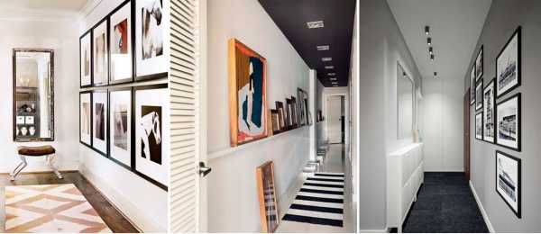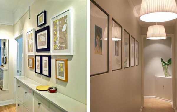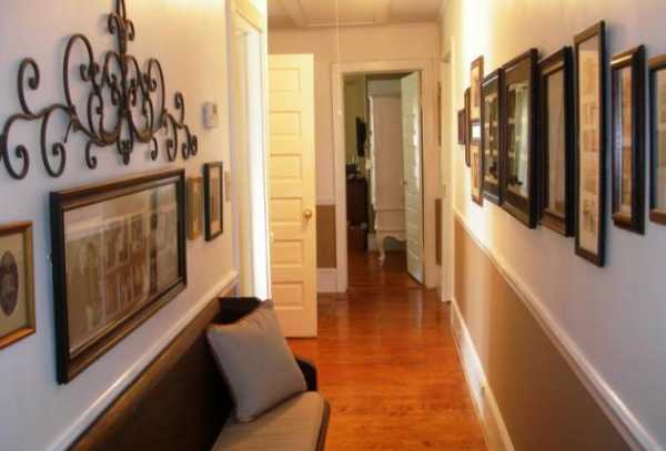 Домашнюю галерею с любимыми фото можно разместить на свободных стенах узкого коридора