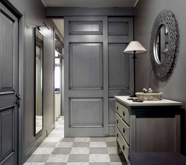 Боковые двери, выходящие в прихожую, также следует задекорировать правильно. Лучше выбирать модели, имеющие матовые стеклянные поверхностей, так как они обеспечат приток естественного света в узкое помещение. Встроенные светильники и яркая мебель также помогут создать неповторимый дизайн и подчеркнуть достоинства и скрыть недостатки в конфигурации помещения.